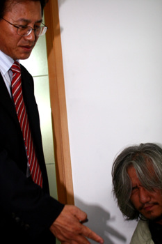 | ▲ 한나라당 장애인위원회 윤석용 위원장이 농성중인 이 후보 대선캠프에 찾아와 박경석 대표와 이야기를 나누고 있다 ⓒ전진호 기자 | ||