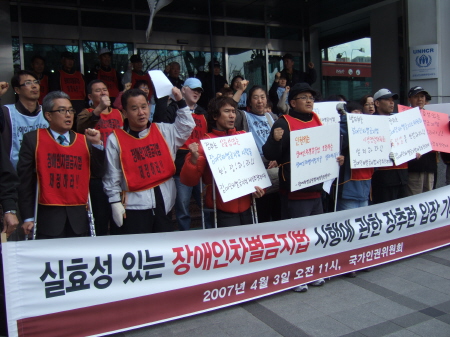 “장애인 차별 문제를 다루는 기본 원칙은 장애인 당사자의 참여다. 장애인차별금지법의 시행령규칙 제정 과정과 권리구제기구에 장애인 당사자의 참여를 보장하라.”