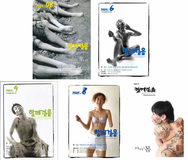 | <함께걸음>은 그동안 감춰져왔던 장애를 당당하게 드러내보자는 취지로 2003년 8월호부터 표지사진을 통해 장애를 드러내는 작업을 해왔다. 이러한 취지로 촬영한 표지들. |