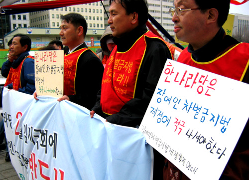 장애인차별금지법제정추진연대(이하 장추련)은 5일 5시 서울 국회 앞 국민은행 앞에서 장추련 소속 회원 30여명이 모인 가운데 '한나라당은 2월 국회 장차법 제정약속을 지키라'며 한나라당 규탄 기자회견을 가졌다.