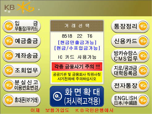 화면 배색, 버튼크기 및 색깔, 배열 등은 정보통신부 및 한국 정보 문화 진흥원에서 마련한 '금융 자동화기기 표준안 1.0'을 그대로 준용하여 더욱 활용도를 높였다.