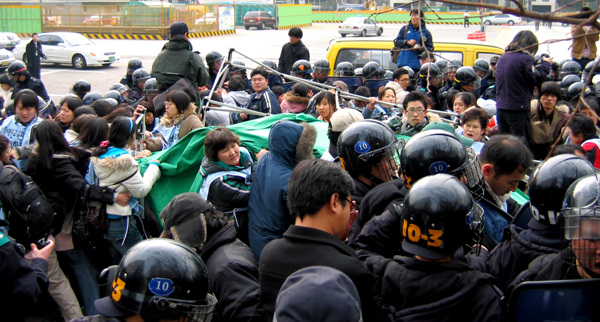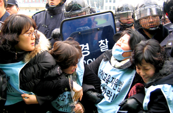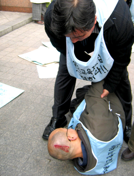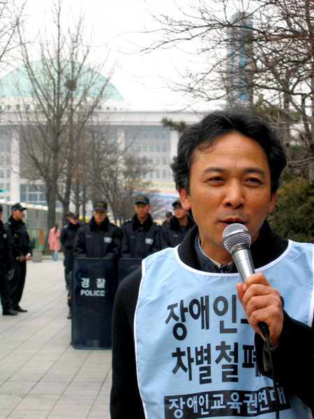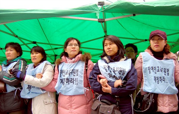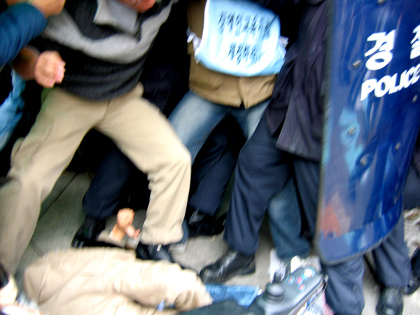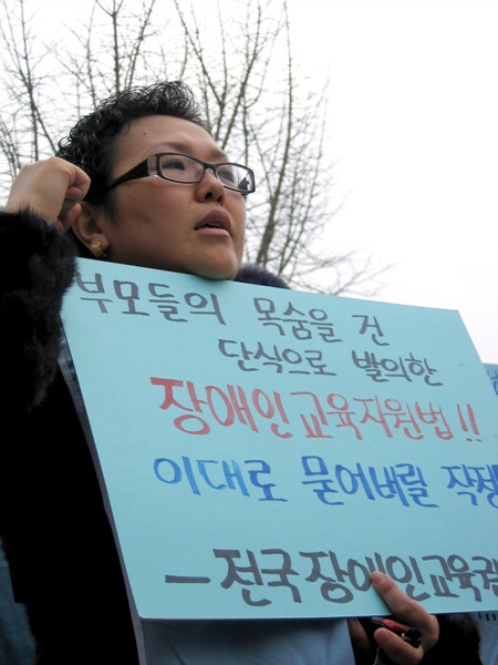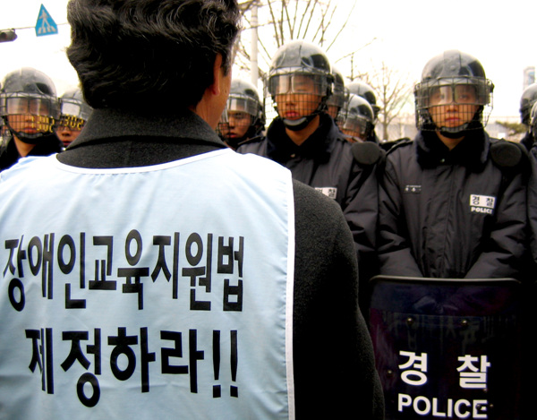 장애인교육권연대는 5일 여의도 국민은행 앞에서 '장애인교육지원법 제정을 위한 단식농성' 선포를 위한 기자회견을 열고 천막농성에 돌입했다. 이를 해산시키려는 과정에서 장애인 한 명이 부상을 입는 등 경찰과 심한 몸싸움을 벌였다.