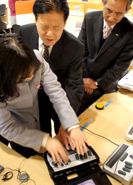 이날 강 차관보는 이날 장애인을 위한 정보격차해소 사업 현황 및 정보화 교육 교재 브리핑을 받은 후, ‘정보통신 보조기기 체험 전시관’에 들러 점자정보단말기 등 전시관의 각종 보조기기를 직접 체험했다.