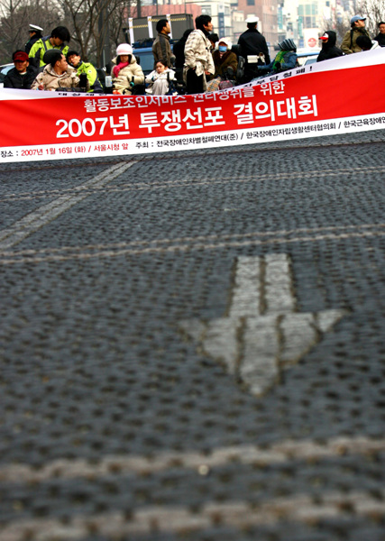 전장연(준) 소속회원 50여명은 16일 오후2시, 국가인권위원회 앞에서 '활동보조인서비스 권리쟁취를 위한 2007년 투쟁선포 결의대회'를 개최했다.