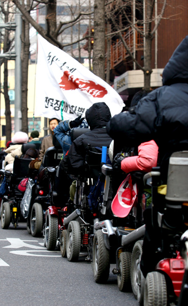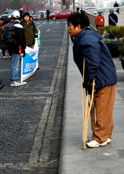 집회를 마치고 인권위 앞에서 '차별천'이라 불리우는 청계광장까지 거리행진을 벌이는 가운데서도 중증장애인들이 세상 속에서 어떤 위치에 있는가를 뼈저리게 느낄 수 있었다.