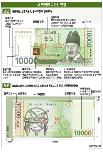 현재 지폐 식별용 점자는 지폐 앞면 왼쪽에 직경 4.3㎜(1000원권은 3.2㎜)의 원형 형태로 볼록하게 인쇄돼 있는데, 1000원권은 1개, 5000원권 2개, 1만원권 3개로 구별된다.