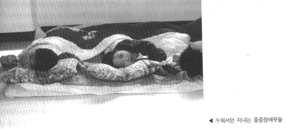 정부의 설립 취지대로라면 중증장애우 요양원은 장애우 중에서도 "가망이 없는" 즉, 내일에 대한 희망이 없는 장애우들이 수용되어있는 곳이라고 볼 수 있다. 그리고 그 규정에 걸맞게 대부분의 중증장애우 요양원은 외진 산골짜기에 숨어 웅크리고 자리 잡고 있다. 어느 모로 보나 비정함을 느끼게 하는 중증장애우 요양원, 그 중에서 두 곳 은혜와 문혜 장애우 요양원을 찾아 잊혀진 장애우들을 만나 보았다.