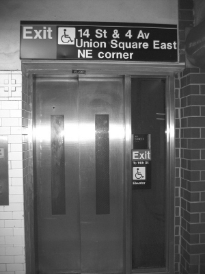 | ▲뉴욕 맨하탄 유니온 스퀘어 14가의 지하철 편의 시설. 뉴욕의 지하철은 역사가 거의 100년이나 되어서 서울보다 휠씬 낡고 지저분했다.엘 리베이터가 없어 장애우들이 접근할 수 없는 지하철도 아직 많다고 한다. 이 역에는 최근에야 엘리베이터가 생겨 장애우들이 이용하기 시작했단다. 이 지하철역은 지상에서 개찰구로, 개찰구에서 플랫홈으로 엘리베이터를 두 번 타야 한다. |
