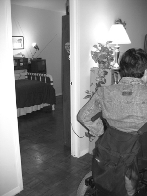 〈함께걸음〉에서는 지난 2월호 특집에서 임대 아파트 화장실에 휠체어가 들어가지 않아서 볼일을 보려면 마트 화장실까지 가야한다는 한 장애우의 상황을 보도한 바 있는데, 덩치 큰 전동휠체어를 타고도 화장실 안에서 왔다갔다하는 모습을 보니 그저 놀라울 따름이었다. 그리고 침대에는 그가 침대에서 움직일 수 있도록 하는 보조기구도 있었다. 장애관련 보조기구는 소득이 없는 경우 정부에서 무상으로 제공한다고.다만 해마다 예산의 상황에 따라서 제공되는 보조기구의 질은 조금씩 다르단다.