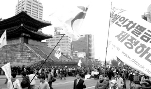 이날 오후 4시경 결의대회를 마친 420공동투쟁단 800여명은 서울역에서 숭례문과 시청 앞을 지나 국가인권위원회까지 장애우들의 인권 현실과 3대 투쟁과제를 시민들에게 알리는 행진을 했다. 이 행진의 선두에서는 전국장애인교육권연대 구교현 조직국장이 마이크를 잡고 서울시민들을 향해 장애우의 날이 만들어진 배경과 문제점을 알리고 장애우가 사람답게 사는 세상을 만들어 가기 위해 ‘장애우의 날’을 ‘장애우 차별철폐의 날’로 바꾸고 싸워나갈 것이라고 말했다.