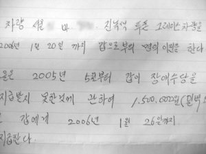 | ▲신문배급소 사장인 손 씨가 구 씨에게 준 각서. 차량명의를 이전할 것과 구 씨가 피해본 생계비 중 일부를 지급할 것을 약속했다. 그러나 아직 돈을 주지 않고 있단다 |