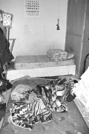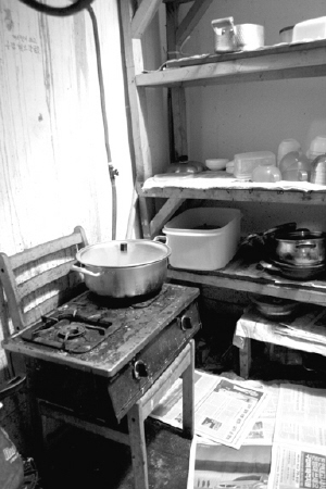 계단을 내려가자 환기가 되질 않아 고여 있던 퀘퀘한 냄새가 확 올라왔다. 배급소 안에는, 잠자리로 이용되는, 나무판자로 3면을 덧대어 만든 형편없는 2개의 공간-방이라고도 할 수 없는-이 있었다. 두 공간을 합해봤자 3평 남짓했는데, 여기서 많게는 열 댓 명이 잔다고 했다. 그리고 계단 바로 아래 취사를 할 수 있는 가스렌지와 부엌살림이 조악하게 쌓여 있었다. 벽에는 설거지를 하면 돈을 가불해준다는 쪽지 등 생활과 관련된 각종 규칙이 적힌 종이와 배급현황 등이 어지럽게 붙어 있었다.