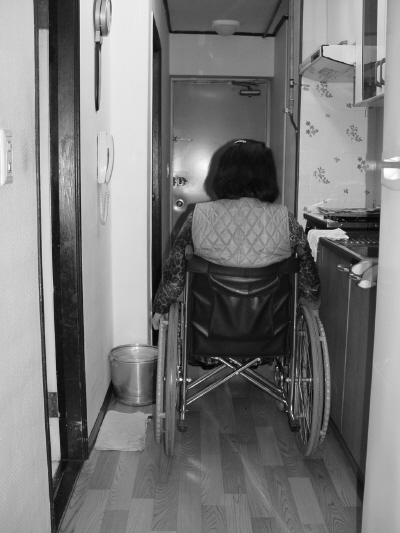 가사도우미가 와서 방을 치워준다고는 하지만 대부분의 시간을 누워지내면서 소변주머니로 소변을 받아내고 있기 때문인지 생활시설에서 날법한 독특한 냄새가 나고 있었다. 그는 외출은 생각도 안한다고 했다. 당장 저녁 두 시간도 와 줄 사람이 없는 상황에서 외출에 필요한 것들을 챙긴다는 게 말이 되지 않기 때문이다. 그 때문에 지원받은 전동휠체어는 제 역할을 하지 못한 채 작은 방에 놓여 있을 뿐이었다.
