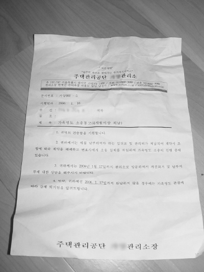 이수찬씨는 결국 형의 의료비로 인해서 또다시 4개월째 관리비를 연체했고, 지금은 주택관리사무소 가양관리소장으로부터 가옥명도 소송을 통고받은 상황이다. 현재 살고 있는 집을 비워줄 것을 요구하는 이 소송은 판결이 내려지면 현재 거주자를 강제로 퇴거시키고 거주자에게 강제퇴거에 들어간 비용까지 청구할 수 있게 된다. 그가 받은 소송 통고장에는 “1월 17일까지 그동안 밀린 임대료 및 관리비를 완납하지 않으면 명도소송 판결에 따라 강제퇴거시키겠다”는 내용이 담겨있었다.