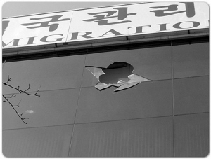 사진은 당시 그가 떨어지면서 깨진 창문 모습. 셀림씨의 죽음은 단속추방정책과 출입국관리사무소의 반인권적 환경이 얼마나 이주노동자들의 삶의 옥죄고 있는지를 보여주고 있다.