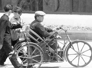 ▲평양시창광거리에서한장애인이삼륜자전거를타고손으로돌리며지나가는모습