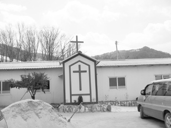 알루미늄 판넬 조립식 건물로 지어진 ㄱ자 형 건물 한가운데에 뻘건 대형 십자가가 세워져 있었다.