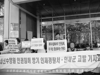 ‘조건부신고복지시설생활자인권확보를위한공동대책위원회(준)’(이하 시설공대위)는 지난 4월 26일 국가인권위원회 앞에서 강원도 인제군 인제경찰서를 인권위에 진정하고, 인제군청을 검찰에 고발하는 기자회견을 열었다.