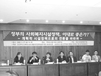 지난 5월 27일 국회에서는 "조건부신고복지시설생활자 인권확보를 위한 공동대책위원회(준)"과 "사회복지시설민주화와 공공성 쟁취를 위한 전국연대회의"가 주최한 "참여정부의 사회복지시설정책, 이대로 좋은가"라는 주제로 토론회가 열렸다.