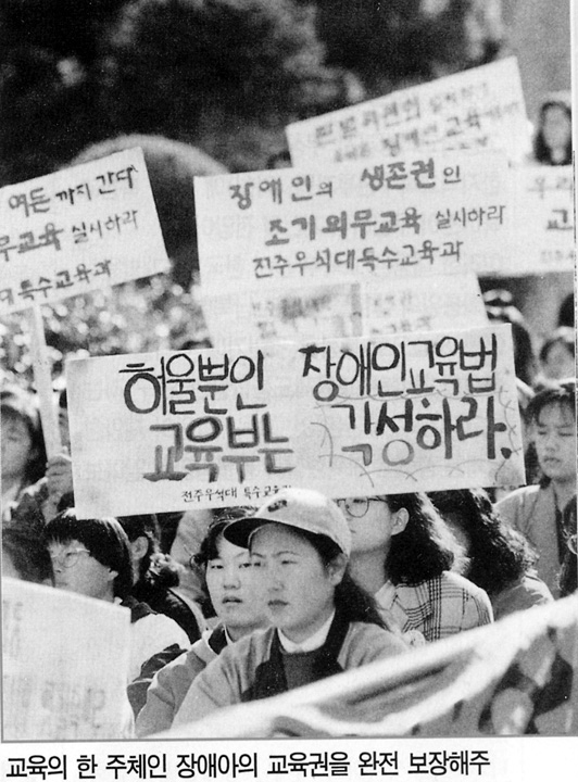 장애우 교육에 관한 힘겨운 투쟁은 97년에도 계속되고 있었다. 특수교육진흥법의 개정과정 내내 장애아동의 유치부교육과 고등부 교육을 의무교육과정으로 지정해야 한다고 주장했지만 끝끝내 무상교육체제로 남았기 때문. 게다가 그 무상교육이라는 것도 실제 수요에 턱없이 모자라 제대로 시행되지 않았다.