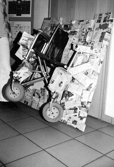 | ▲핍에 들어서자 가장 먼저 눈에 띄는 조형물이 있다. 휠체어가 벽 같은 것을 뚫고 나오는 모습이다. 장애를 가진 사람들이 벽을 벽으로 느끼지 말고 주체적으로 맞서야 한다는 의미란다. 일상의 모든 장벽으로부터 해방되어야 한다는... |
