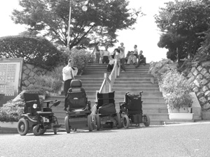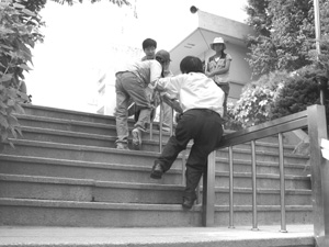 중증장애우들은 타고 왔던 전동휠체어를 계단 밑에 놔둔채, 짐짝처럼 업혀서 들려올라가거나, 난간을 붙잡고 위태위태하게 올라가야만 했다.