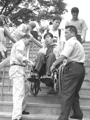 표창식에 참석하려던 장애우들은 계단 앞에서 그저 ‘망연자실’할 수 밖에 없었다.