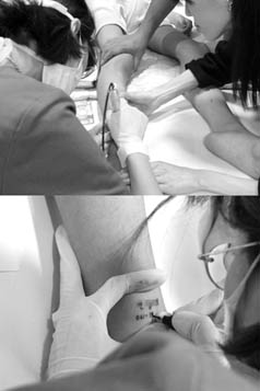 | ▲자폐를 가진 장애우의 발목에 이름과 전화번호를 새기고 있다. 이 시술을 주최한 의사들은 사랑으로 했단다. 이 장애우가 과연 반바지를 입을 수 있을까 |