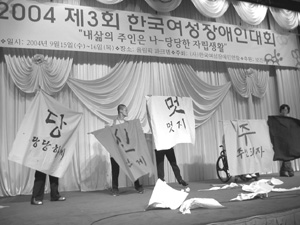 지난 9월 15일부터 16일까지 서울 올림픽파크텔에서는 세 번째 ‘한국여성장애인대회가’ 열렸다. (사)한국여성장애인연합(이하 여장연)의 주최로 진행된 이 날 행사에는 여장연의 10개 지부, 약 3백여명의 여성장애우들이 모여 ‘내 삶의 주인은 나-당당한 자립생활’이라는 주제로 이틀 동안 토론회와 결의대회를 가졌다.
