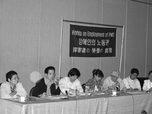 - 3국 장애우의 노동현실을 보면 한국에서는 지금까지 장애우 고용에 많은 기여를 한 장애우 고용장려금이 대폭 삭감되었다. 또 일본에서는 노동권이 없는 보호작업장이 장애우들에게 강요되고 있다. 필리핀에서는 장애우가 일할 장소가 거의 없으며 공적기관은 의무고용조차 지키지 않고 있다. 우리는 3국의 정부에 이런 장애우 노동 현실을 개선해 줄 것을 강력하게 요구한다.