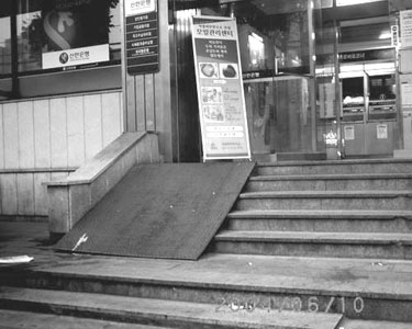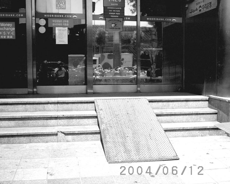 대부분의 은행은 1층에 있다. 그러나 1층이라도 꼭 몇 개의 계단을 올라가야 한다. 이는 비단 은행만의 문제는 아닐 것이다. 그 건물 자체의 문제고, 어쩐 일인지 우리나라 건축물 대부분이 계단과 턱이 없는‘천연 1층’은 거의 없다. 그런데, 이것에 대해 문제제기를 하는 사람은 아무도 없다. 왜? 아무 불편 없으니까. 늘상 그런 것들을 보아왔으니까.