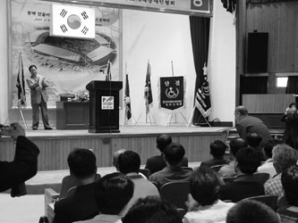 장 회장이 단상으로 올라가자, 사회자는 중앙회장의 방문을 축하하는 꽃다발 증정식이 있겠다고 말했다. 한 여성이 단상에 올라 장 회장에게 꽃다발을 증정했다. 이어 국민의례가 이어졌다.