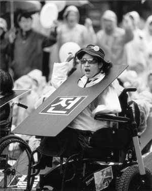 김대성: 세 가지 패러다임의 변화가 있어요. 재활→인권, 경증장애→중증장애, 전문가→당사자로 말이지요. 전에는 ‘지체’ 하나의 개념이었는데, 이제는 지체 중에도 절단, 척수, 근육디스트로피, 뇌성마비 등으로 세분화되고 있어요 또 경증이 집에서 나올 수 없고 시설에만 있는 중증 장애우의 목소리를 대신했는데, 당시에는 그럴 수밖에 없었죠. 가장 억압과 고통 속에서 피해받는 집단이 중심에서 목소리를 내는 건 당연하지만 다른 사람이 대신 내는 목소리는 한계가 분명했죠. 내 권리, 내 고통에 대해서는 당당히 내가 이야기하겠다는 거죠. 그동안 차분히 준비하고 또 사회적 분위기도 점차 변하니까 운동세력의 역량이 강화되는 것입니다. 이동권도 단순한 소아마비 장애우보다 휠체어 탄 사람이 설득력 있는 거 아닙니까. 모든 것이 맞물려 앞으로 경증장애우는 뒤로 물러서고 중증장애우의 활동력은 더욱 왕성해질 것입니다.
