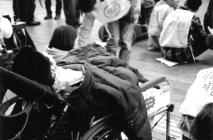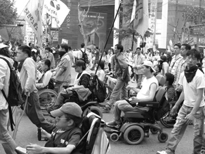 김대성: 장애 가진 사람들이 목소리를 내기 시작한 건 80년대 후반이었습니다. 그렇다면 그전엔 없었냐? 그건 아니죠. 미비했을 뿐이죠. 과거 시각장애우들이 안마업과 관련해 대정부 투쟁을 하면 그걸 인권운동이라 보지 않았습니다. 근래의 투쟁은 전 장애계의 이해와 요구에 해당되는 것들을 전면에 내세운, 명분이 너무나 분명한 투쟁이라 인권측면에서 이해되어지는 것입니다. 그러나 준비되지 않은 상황 속에서 그게 가능했을까요? 80년대 김순석씨의 자살도 있었지만 꿈쩍도 하지 않는 시대가 있었습니다. 전두환, 노태우를 거쳐 민주화투쟁까지, 그런 시대적 상황은 영향을 주는 거죠. 내부에서는 끊임없이 소모임 활동을 하고 그러면서 점차 조직을 만들어간 것입니다. 그 후 각 영역별 구체적 요구안들은 그 때 다 언급되고 요구 안으로 정리된 것들이죠. 지금 주장하는 것들은 갑자기 불쑥 나온 것이 아닙니다.