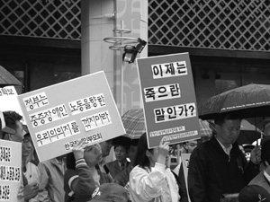 “노동할 수 있는 권리를 빼앗는 것은 생존을 위협하는 것이다. 장애우를 죽게 만드는 정부의 살인을 막아야 한다”