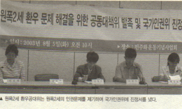 올해는 미국이 인류 역사상 최초로 핵병기인 원자폭탄을 일본에 떨어뜨린지 58년째 된다. 이에 지난 8월 5일, 9개 인권사회단체들은 ‘원폭 2세 환우(患友) 문제해결을 위한 공동대책위원회(이하 원폭2세 환우 공대위)’를 꾸려 국가 인권위원회에 진정서를 제출했다.