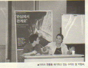 지난 7월 22일 프레스센터 12층에서는 한국 이라크 반전평화팀의 통역을 맡아주고, 어려운 일이 있을 때마다 함께 해준 이라크 여성 수아드 알 카림씨와 한국의 젊은 평화운동가들의 만남이 있었다. 전쟁 전 직업이 여행 가이드였기 때문이었을까? 그녀는 누구보다도 조국 이라크에 대한 애정과 희망을 갖고 있는 듯 했다. 반전평화팀의 일원으로 참여했던 임영신씨는 “통역원들이 많은 돈을 요구하기도 했지만 수아드는 어려운 지역에 들어가면 먼저 눈물을 보이며 그 돈을 남김없이 지역주민에게 주고 왔다”며 그이의 마음속에 진정한 평화의 씨앗이 녹아있음을 이야기했다. 수십 년 간 사담 독재정권 하에서 모든 것이 통제되었던 상황이라 4-500만의 엘리트들이 이라크를 떠났고 NGO라 불릴 만한 조직 하나 없는 이라크. 때문에 평범한 시민의 눈으로 본 전쟁을 이야기하는 것이 가장 진실에 가까운 것일지도 모르겠다. 그녀에게 전쟁은 무엇이었으며, 미국은 무엇이었을까?