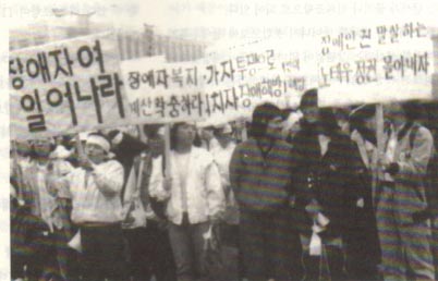 이러한 인식변화는 우리 장애우계에서도 폭넓게 일어나고 있었다. 전에는 장애우를 위해서 일하는 전문가나 시설기관에 의해서만 장애우 문제가 해결될 수 있다고 생각하고 있었다. 그러나 80년대 후반을 지나면서 장애우 문제는 사회구조적으로 발생되는 문제임을 깨달은 젊은 장애우들은 장애우 문제를 해결하기 위한 자기 목소리를 강하게 내기 시작했다.