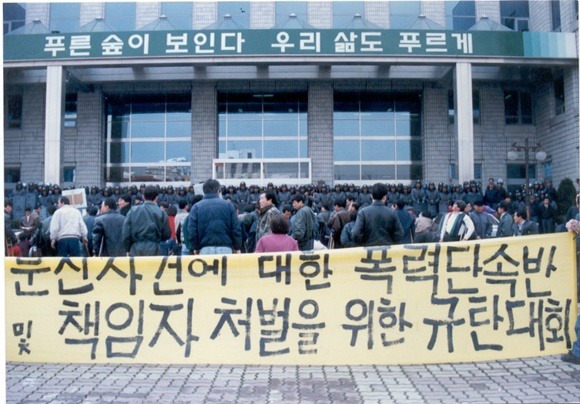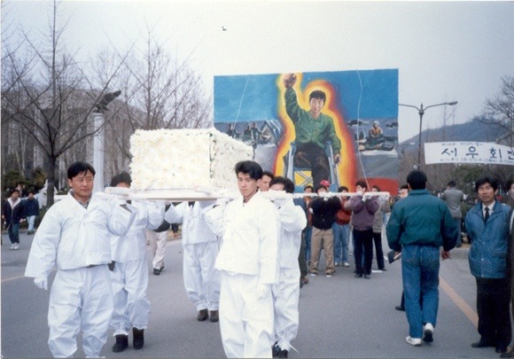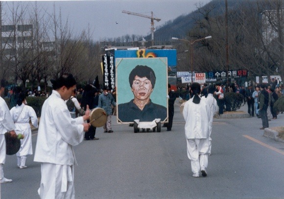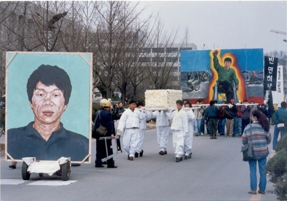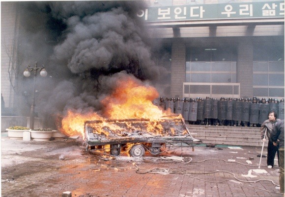 최씨의 주검이 동료들에 의해 경기도에 있는 용인 카톨릭동원묘원에 조용히 묻히는 같은 시각, 시내 곳곳에선 최정환 씨를 애도하는 많은 사람들의 치열한 시위가 벌여졌다. 특히 최씨의 장례식이 예정돼 있던 연세대 정문 앞은 그야말로 난장판이었다. 깨어진 유리조각들, 희뿌옇고 매캐한 최루탄 가스, 그리고 여기저기 그을려진 모습은 왜 이들이 이렇게 싸울 수밖에 없었는지, 왜 이렇게 울분을 토하는지에 대한 생각을 다시 하게 만들었다.