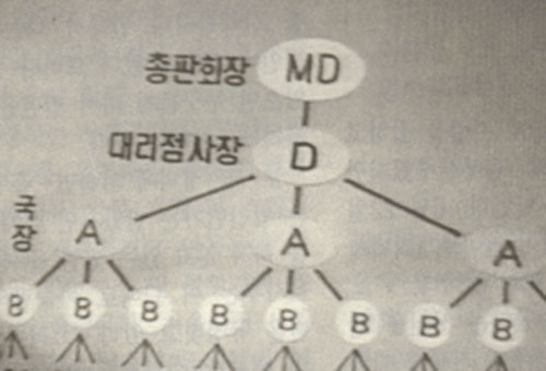 한 사람이 두 명의 새로운 고객을 확보하고 그들은 곧 사업가로 변해 또 다른 네 사람의 고객을 확보하는 그래서 핵분열이 일어나듯 연쇄반응적으로 소비자가 늘어나는, 그래서 기하급수적으로 수입이 늘어나는 "도박"과 같은 것이다.