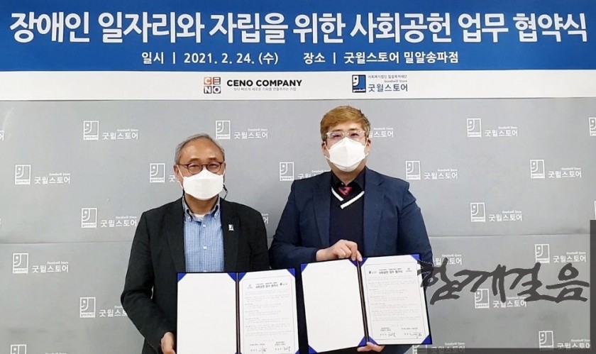 밀알복지재단 굿윌스토어(본부장 한상욱)가 헬스&뷰티 전문기업인 ㈜세노컴퍼니(대표 홍종국)와 24일(수) 정기후원 업무협약을 체결했다.