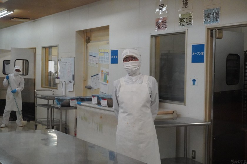 △ 간바컴퍼니 공장에서 근무하고 있는 아사우미 유리씨, 흰 위생복을 입고 있다.