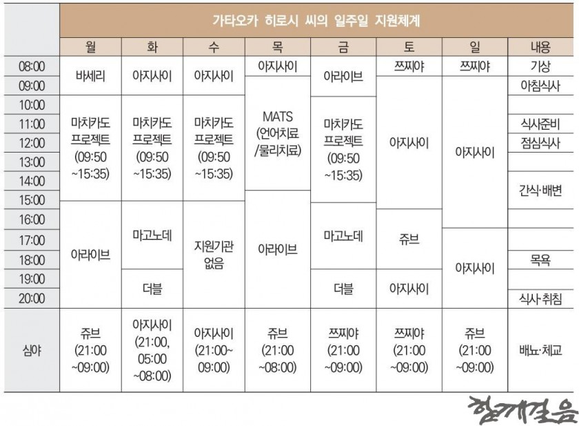 가타오카 씨가 낮시간에 이용하는 서비스는 마치카도 프로젝트만이 아니다. 아라이브, 쥬브, 마고노데, 쯔찌야, 아지사이 등 다양한 방문개호 서비스 제공기관으로부터 서비스를 받고 있다. 또 주 1회는 언어치료와 물리치료를 받고 있다.