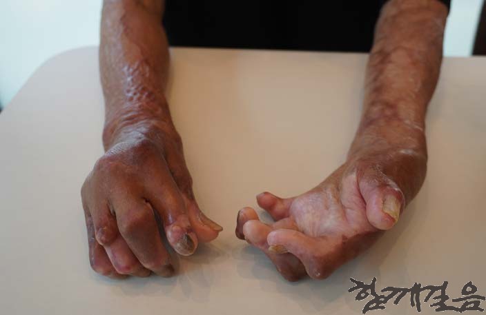 △ 화상으로 인해 변형된 정인숙 씨의 손