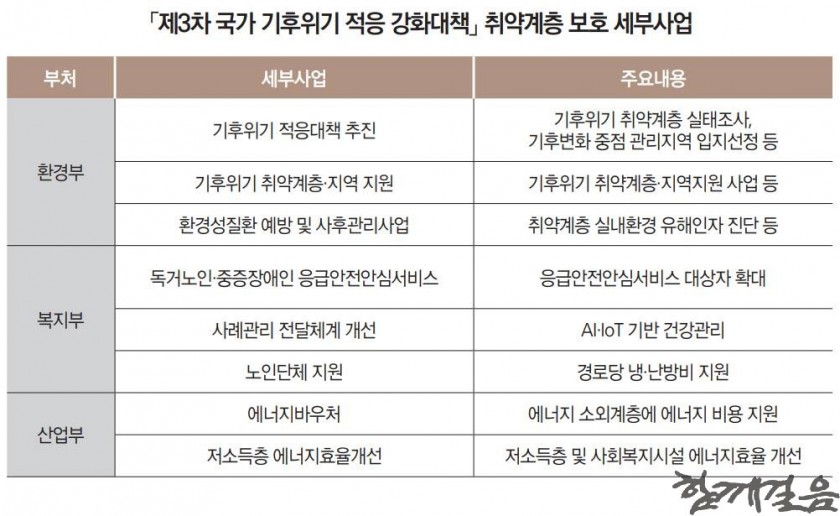 또한, 취약계층 보호를 위해 실태조사와 정책권고 가이드라인 마련 및 고령자 건강관리 서비스, 야외 근로자 기후 적응 수단 개발, 냉·난방 에너지바우처 지급 등을 지급하고 이를 위해 약 2조 1천억 원(국가 기후위기 적응 강화대책 예산의 9.3%)을 책정하겠다고 대대적으로 홍보한 바 있다.