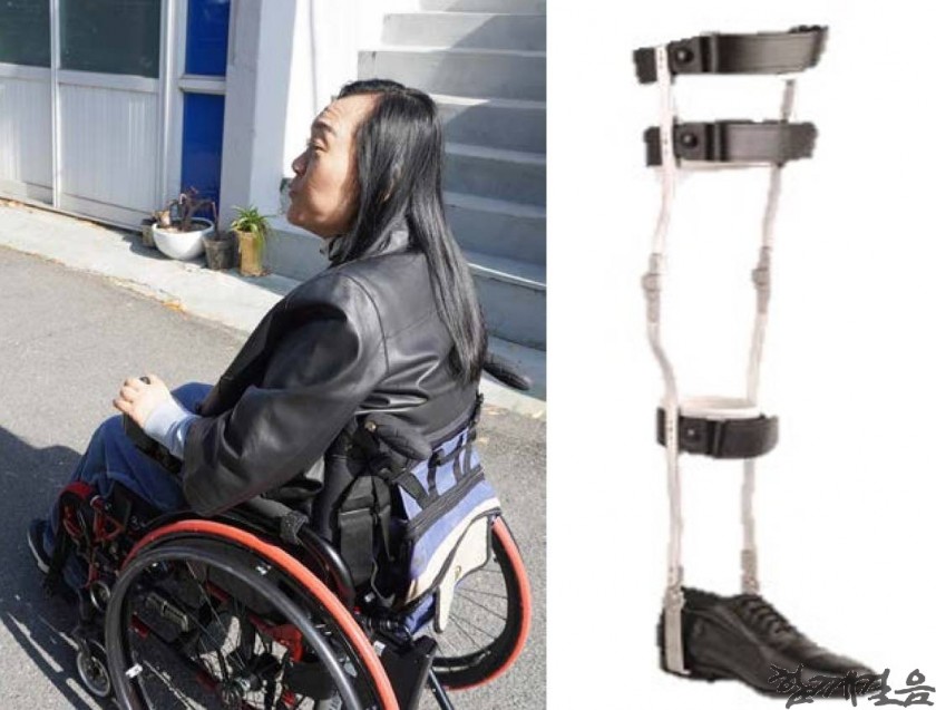 △ 휠체어로 이동하는 오성윤 씨(왼쪽), 김효진 씨가 착용하는 보조기기의 모양(오른쪽)