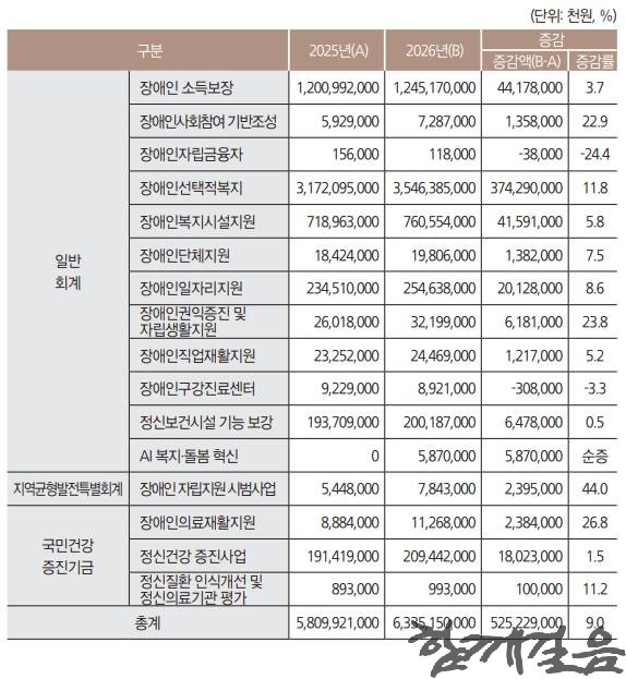 2026년 국회에서 확정된 보건복지부 예산은 총 137조 4,949억 원으로, 이 가운데 장애 관련 예산은 6조 3,351억 원이다. 이는 전년도 장애 관련 예산 대비 약 9.0% 증가한 규모로, 보건복지부는 장애인의 생활안정 지원과 재활 지원을 강화하기 위한 재정 확대라고 설명하고 있다.