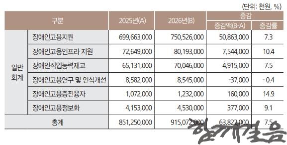 2026년도 고용노동부의 장애인 고용 관련 예산은 9,150억 7,200만 원으로 편성됐다. 이는 전년도 8,512억 5,000만 원 대비 약 7.5% 증가한 규모로, 장애인 고용의 안정적 유지와 고용 기반 강화를 중심으로 예산이 확대됐다.