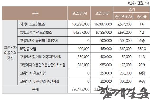 또한 순증된 예산을 살펴보면, 교통약자 이동편의증진계획은 5년 주기로 수립되는 법정 계획으로, 올해 해당 주기에 맞춰 예산이 편성됐다. 교통약자 홍보사업은 올해 신규로 도입된 사업으로, 교통약자의 대중교통 이용에 대한 사회적 인식을 개선하기 위한 대국민 캠페인과 저상버스 예외노선 적정성 현장조사를 추진하기 위해 마련됐다.