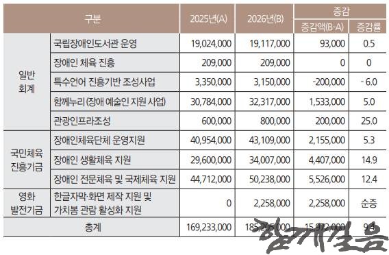 체육 분야에서는 국민체육진흥기금을 중심으로 예산 확대가 두드러졌다. 장애인체육단체 운영지원 예산은 5.3% 증가했으며, 장애인 생활체육 지원은 14.9%, 장애인 전문체육 및 국제체육 지원은 12.4% 늘어났다. 이는 장애인의 일상적 체육 참여를 확대하는 동시에, 전국·국제대회 참여 여건을 강화하려는 정책적 의지를 반영한 것으로 보인다.